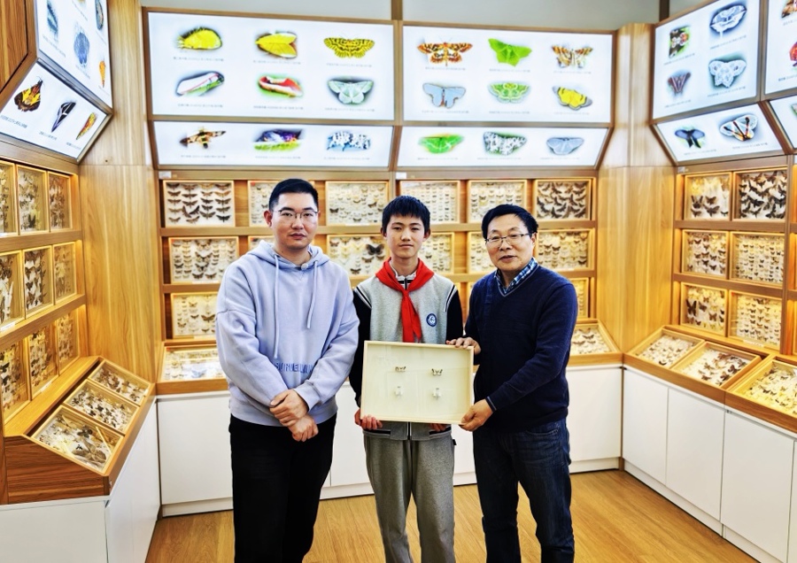 “60后”的张宁(右)、“90后”康健秋(左)和“10后”滕君乐(中)手持白端浪缘尺蛾标本