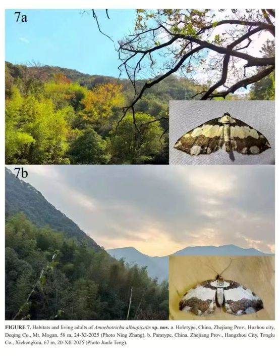 2025年11月下旬,莫干山寒意袭人。张宁和同事顾泓在酒店外布下了一盏灯。次日清晨收灯时,气温已降至8℃,两人做好了“空手而归”的准备。然而,就在湿漉漉的帐篷布褶皱处,张宁凭着多年的蝶蛾观察经验锚牢了一个似曾相识但又有些不同的“老面孔”——浪缘尺蛾雄性个体。他对着这只正处于休止状态的小生灵按下快门,并把它收集到昆虫采集盒之中。回到上海整理海量资料时,张宁越看照片越觉得“不对劲”:这只蛾子前翅顶角位置,似乎比已知的种类多出了一块几毫米的白斑。经过生殖器解剖和大量中外文献翻阅,康健秋初步判断这极可能是一个新物种。